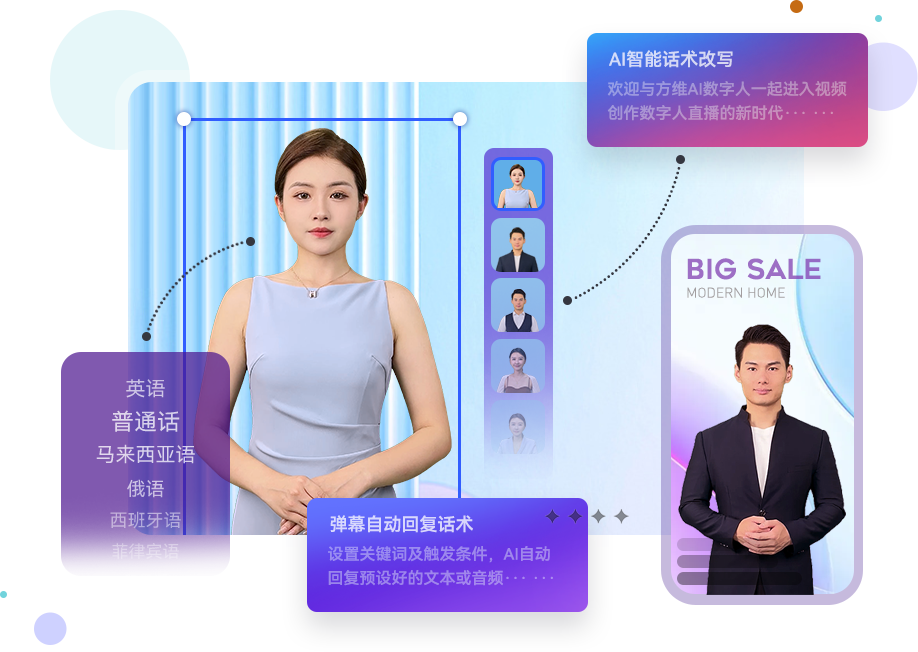 AI數(shù)字人定制 / 數(shù)字人直播 / AI短視頻生產(chǎn) / AI語音合成 / 場景化模板 / 智能腳本